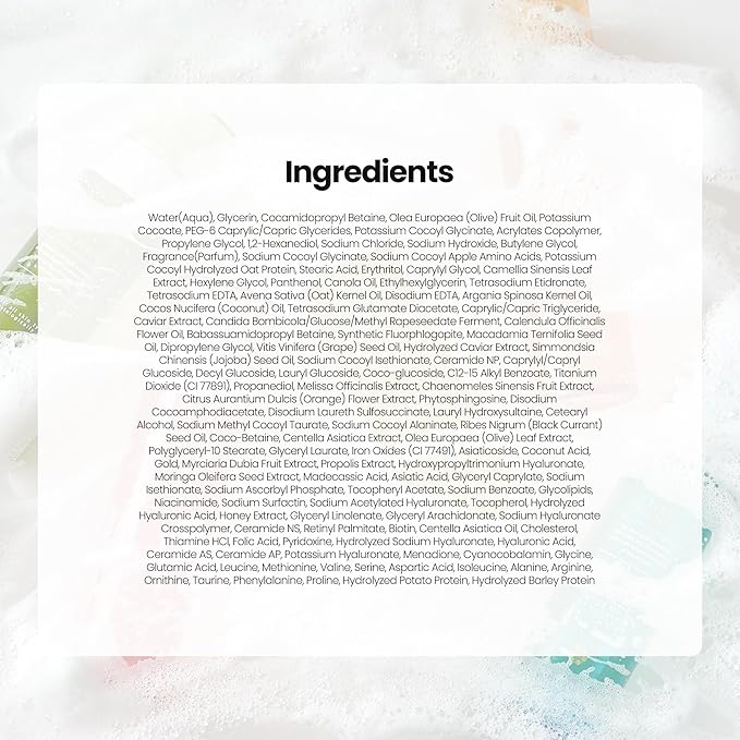 - SKIN-LOVING INGREDIENTS. Fortified with Caviar Oil and Hydrolyzed Caviar Extract, this hydrating face wash supports elasticity and strengthens the skin barrier. Niacinamide refines texture, while plant-based surfactants ensure a gentle cleanse. Propolis Extract and Centella Asiatica soothe and replenish, perfect for daily use.